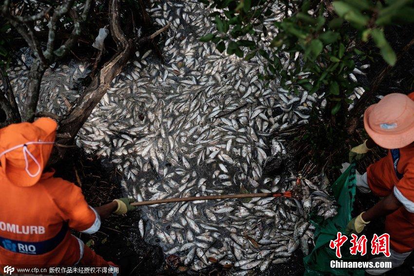 当地时间2015年4月16日,巴西里约热内卢,里约市政工人正在罗德里戈湖内打捞死鱼。该湖将在2016年奥运会期间举办划艇和赛艇比赛。市政工人已经在一周时间内打捞37.4吨死鱼。
