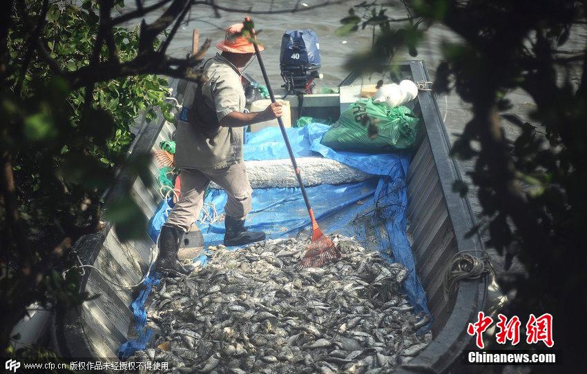 里约工人清理奥运赛场死鱼 一周打捞近40吨