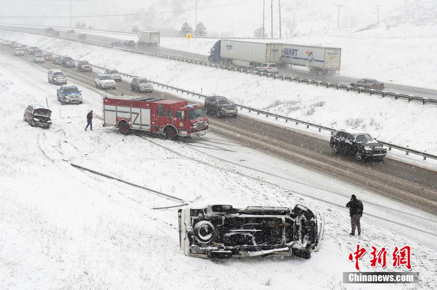 当地时间2015年4月16日,美国科罗拉多州山麓地区,当地迎来降雪,引发高速多车相撞。
