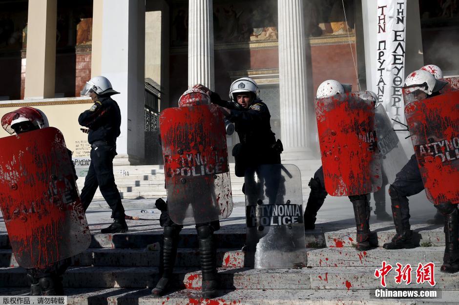 希腊首都爆发大规模游行 示威者向警察泼红漆