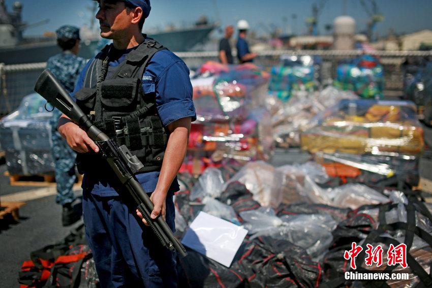 图为美国海岸护卫队成员护卫收缴的可卡因。