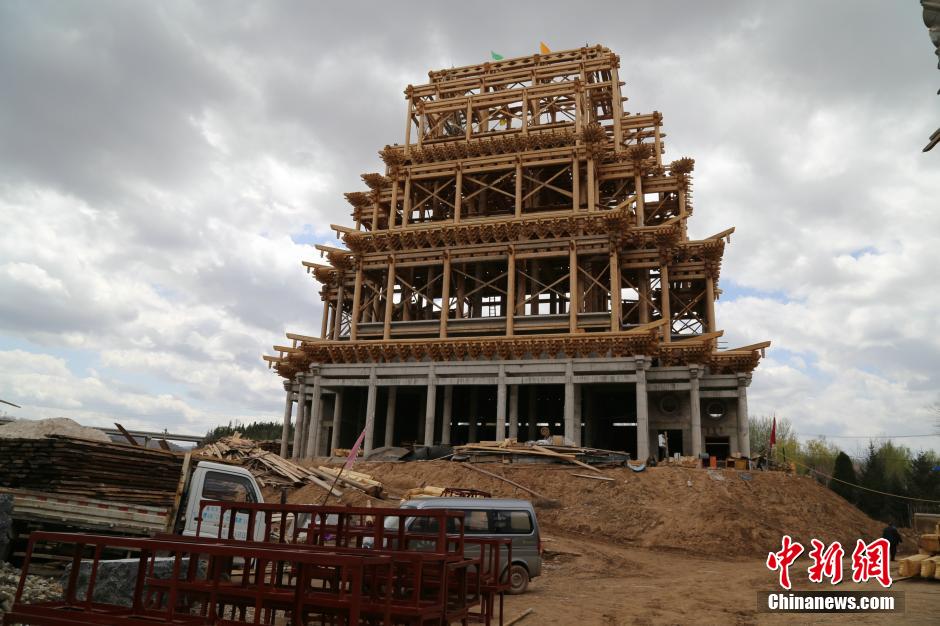 4月19日,甘肃平凉 一高大巨型木建筑正处在建设中。该建筑全部使用原木构造,矗立在圆通寺寺内,目测高达30余米,建筑下面有10余名工匠正在紧张作业。据了解,该建筑名叫“三雄宝殿”,建造已有2年时间,总耗资近1600万余元。 中新社发 仲雁铭 摄 图片来源:CNSPHOTO
