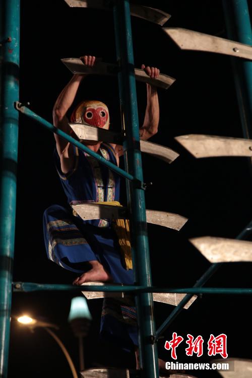 4月18日,广西南宁“三月三 赶大圩”华南城首届民俗文化商贸节开幕,民众展示上刀山、抛绣球等传统民俗。4月21日是农历“三月三”,也是中国壮族的传统歌舞节,广西壮族自治区多地举办相关活动庆祝。中新社发 王刚 摄
