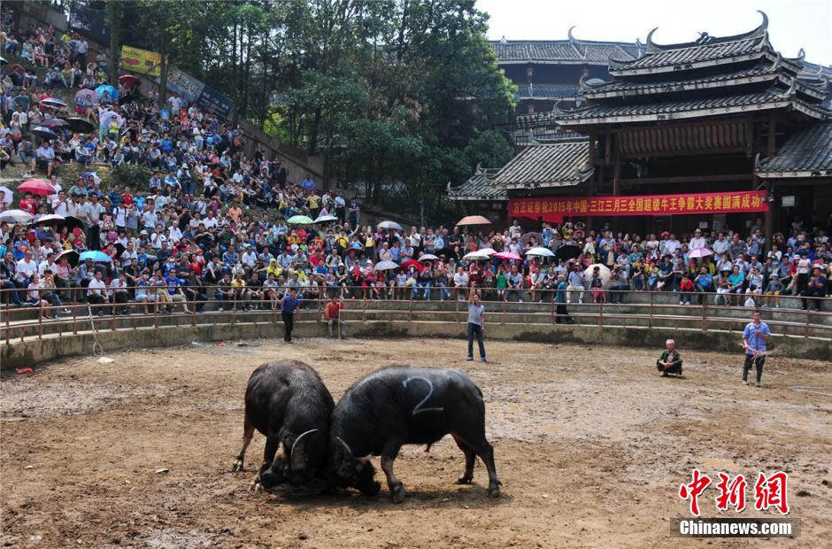 4月19日,为期三天的2015年中国三江“三月三”全国超级牛王争霸大奖赛,来自广西、贵州、湖南、云南、江西等地的近百头牛王为游客上演多场惊险刺激、震撼视觉的斗争,吸引众多观众。侗族地区自古喜好斗牛活动,每逢重大节日、春耕前或秋收后均会举办斗牛比赛。龚普康 摄