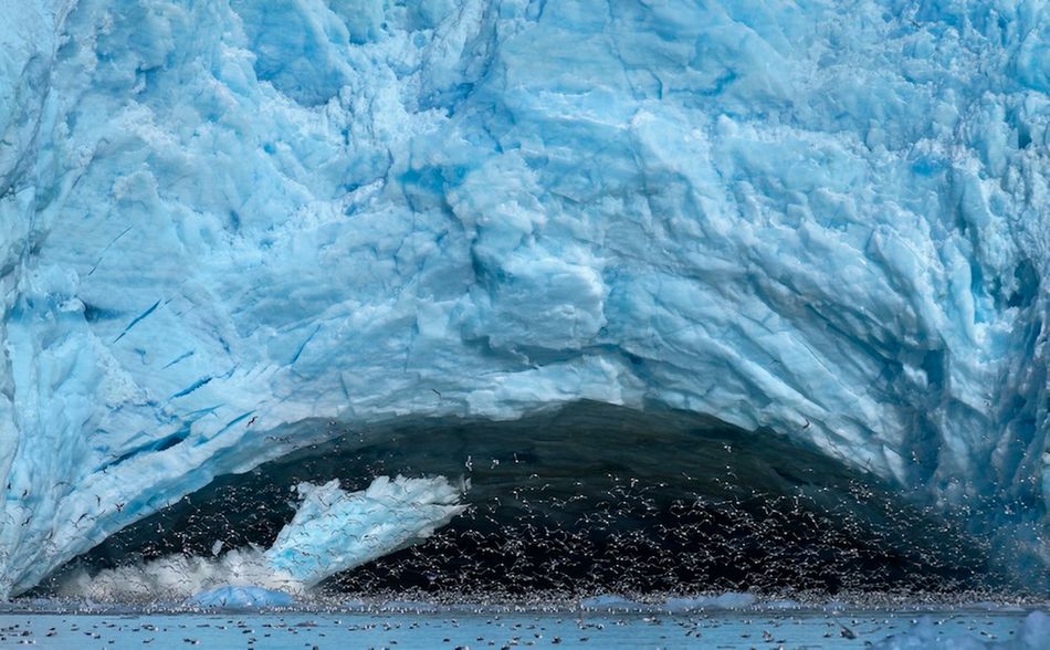 据外媒报道,近日,外媒曝光了一组图片,图片中显示了挪威北部冰川崩塌的一瞬间,成千上万只鸟从冰洞飞出,笼罩整个天空,形成了一道壮观的景色。