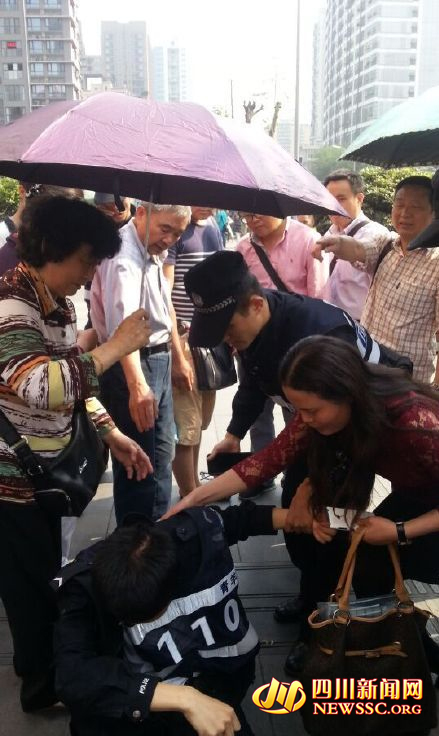 四川新闻网成都4月17日讯(记者 漆奇)今日上午10点过,成都市草市街政务中心门口,一名110巡警在执勤的时候突然中暑昏倒在地,周围路过市民纷纷上前帮助施救,有人为民警解开衣扣保持呼吸畅通,有人在旁为昏倒的民警撑伞,而这感人一幕正好被路过的陈先生拍了下来。