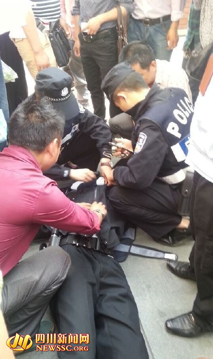 市民和昏倒的巡逻民警同事一起将其衣扣解开,保持其呼吸通畅