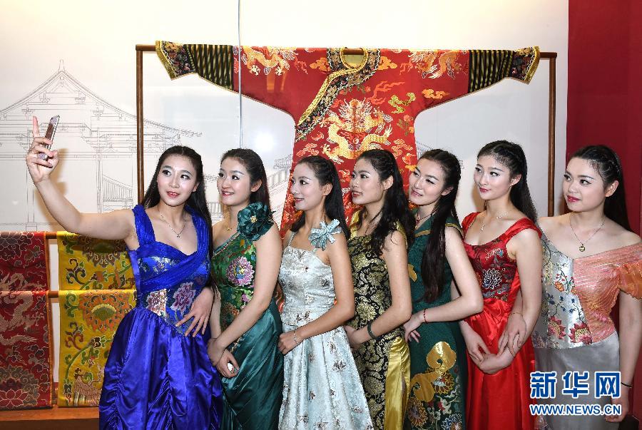 4月19日,参加新展馆云锦文化展示活动的几名大学生身着云锦时装,在清代云锦龙袍复制品展柜前表演。新华社记者孙参摄
