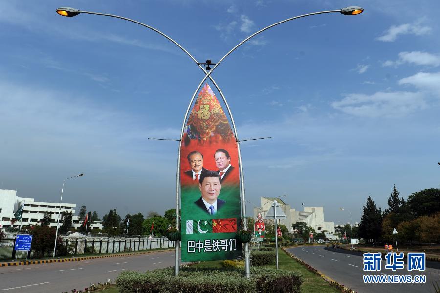 这是4月18日在巴基斯坦首都伊斯兰堡行政区内宪法大道拍摄的欢迎中国国家主席习近平对巴基斯坦进行国事访问的展示板。