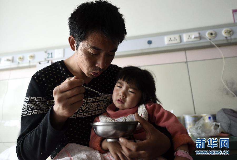 牵动众多网民爱心的山西“喂食爸爸”王志华再次遭遇困境,近日,他的女儿王可然病情出现反复,进食困难,只能以奶粉补充营养,目前正在山西省儿童医院接受治疗。王志华家在山西省左权县农村,家境窘迫,父母都有疾病,他是家中唯一的劳动力。因患有罕见的“贲门失弛缓症”,3岁多的小可然曾无法自己进食,靠父亲王志华嘴对嘴喂食达500多天。在社会各界爱心人士的帮助下,王可然曾经在山西省儿童医院成功接受手术治疗。新华社记者 燕雁摄