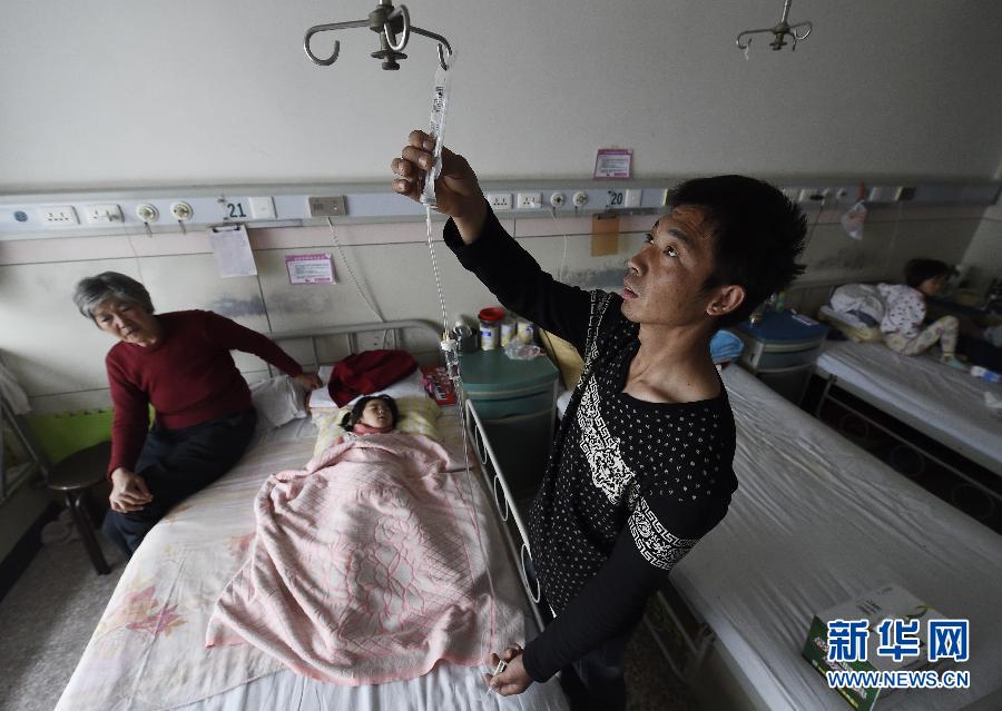 4月19日,在山西省儿童医院,王志华在查看女儿输液的情况。