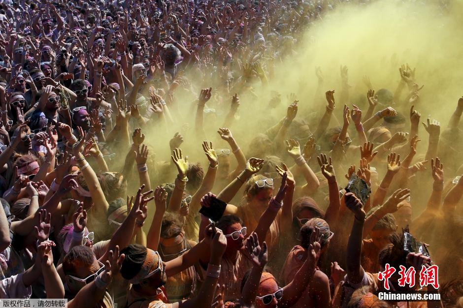 当地时间2015年4月19日,法国巴黎,民众参加五公里彩色跑活动,上演色彩大战。