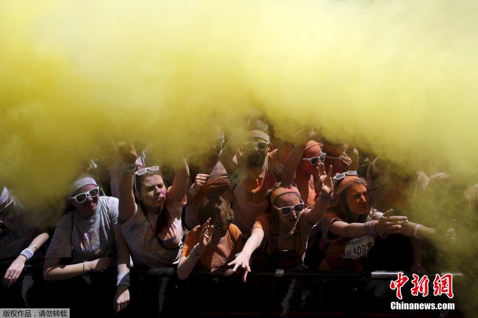 当地时间2015年4月19日,法国巴黎,民众参加五公里彩色跑活动,上演色彩大战。
