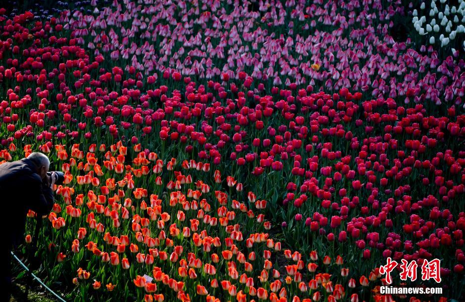 4月20日,北京植物园郁金香已经进入最佳观赏期,近万平米的郁金香花海展区内,105个品种的50万郁金香竞相开放,犹如花的海洋。俯瞰花海,中心区域是一个蝴蝶结徜徉在花海中的美丽图案,花海西侧则是由彩带串联起的两个小蝴蝶图案,这是北京植物园的园艺师们在种植郁金香时设计好的图案。中新社发 陆欣 摄