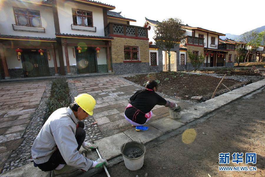 4月11日,工人在雅安市雨城区余家村灾后新建的住宅小区修筑村路。 “4·20”芦山地震后,四川雅安市雨城区南郊乡余家村新村聚居点由成都市组织对口援建,项目总投资7207万元,围绕让当地群众“住上好房子、培育好产业、过上好生活”的目标,统筹实施一村庄、一整治、一产业、一桥梁、一道路“五个一”工程。新村“小桥、古木、流水、人家”的建设风格极具观赏价值,是农房新建和传统村落提升有机统一的生动实践和典型范例。新华社记者李明放摄