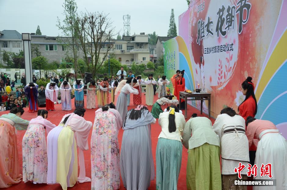 4月19日,四川洪雅县首届“花朝会”举行。当天,近百名雅女身着汉服,在三宝镇中心广场进行了浓重“花神”祭拜仪式。中新社发 刘刚 摄