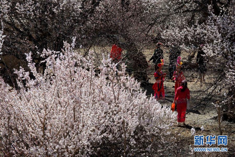 4月19日,游客在新疆哈密地区伊吾县苇子峡的野山杏林内游览。随着气温回暖,生长在海拔2000多米的伊吾县苇子峡的数万棵野山杏树陆续开花,鸟语花香春意浓浓。新华社发(蔡增乐 摄)