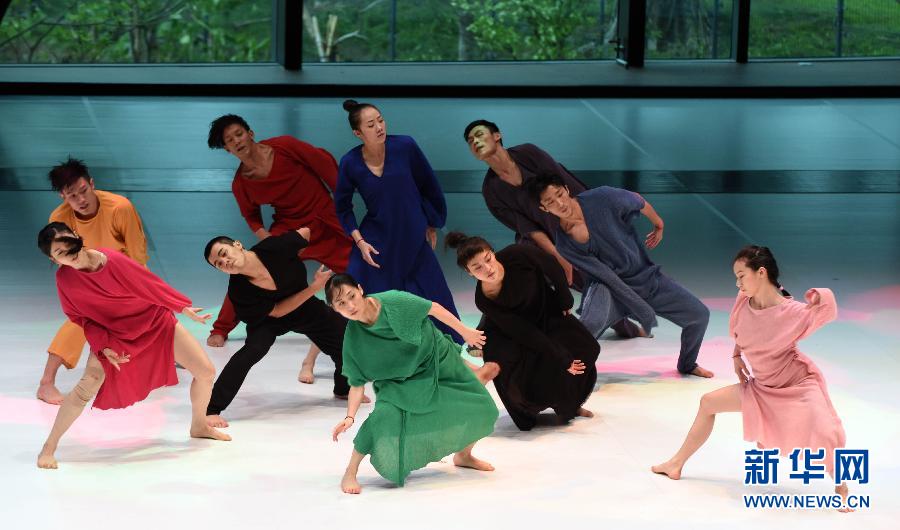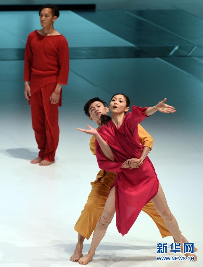 4月19日,演员在云门剧场首演记者会上表演舞蹈《春斗》。