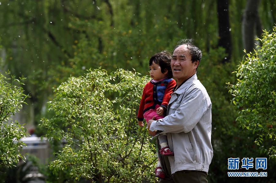 4月20日,一位市民抱着孩子在太原街道上行走。近日,随着天气渐暖,山西太原市大街小巷杨絮、柳絮飘洒,如同一场“四月雪”。 新华社记者范敏达摄
