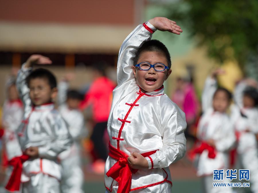 4月21日,北京市丰台区嘉园第一幼儿园的孩子们在表演武术操。
