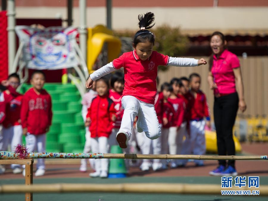 4月21日,北京市丰台区嘉园第一幼儿园的孩子们在参加跨越竹竿跑。新华社记者申宏摄