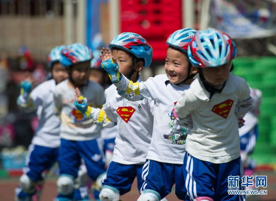4月21日,北京市丰台区嘉园第一幼儿园的孩子们在表演轮滑操。新华社记者申宏摄