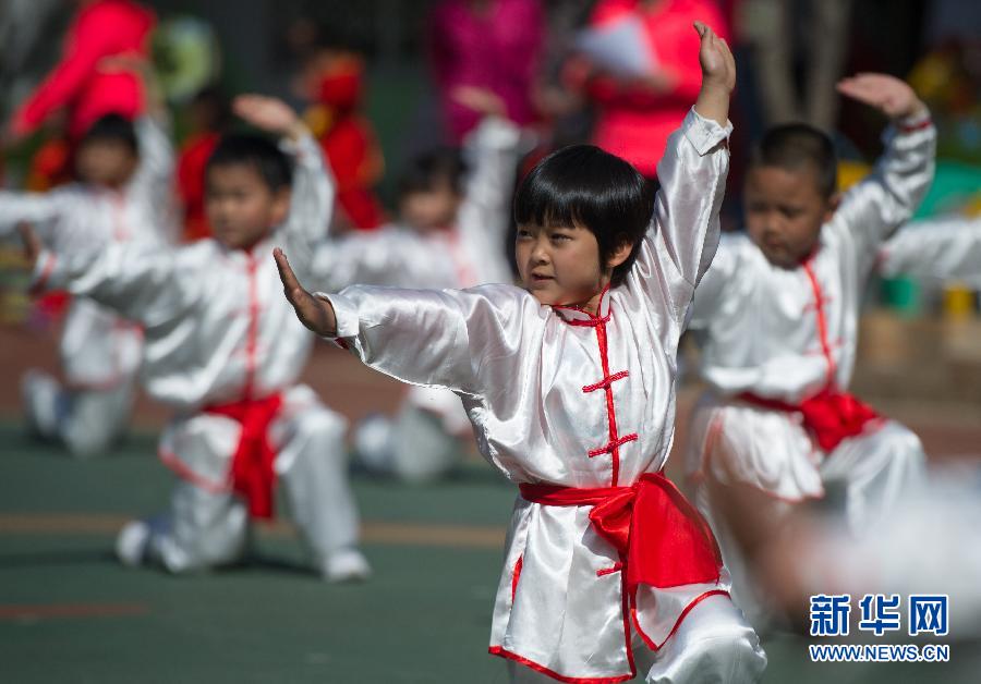 4月21日,北京市丰台区嘉园第一幼儿园的孩子们在表演武术操。新华社记者申宏摄