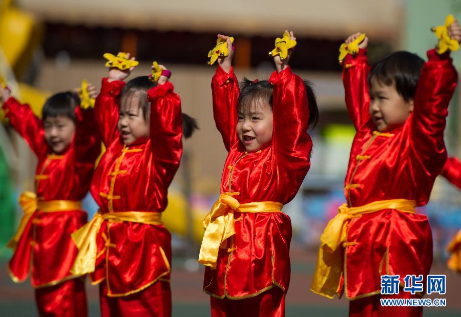 4月21日,北京市丰台区嘉园第一幼儿园的孩子们在表演星星操。新华社记者申宏摄