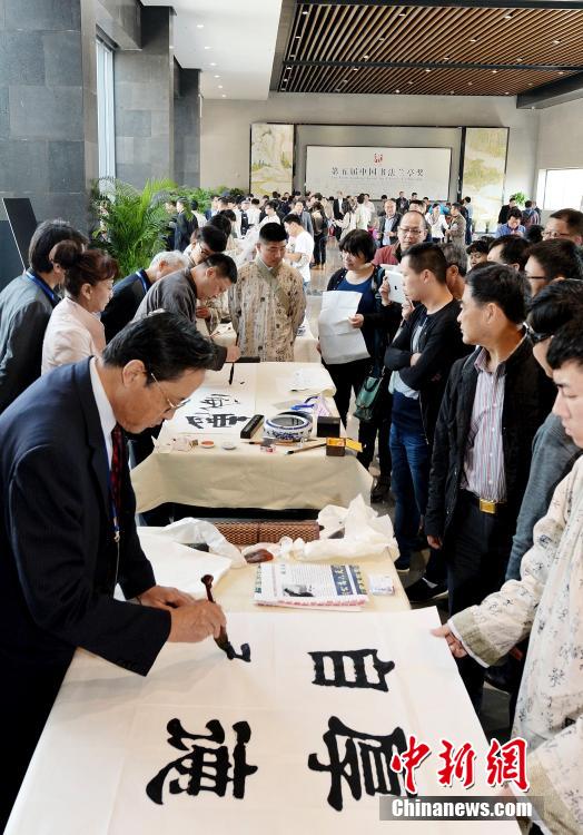 4月21日,第三十一届中国兰亭书法节在中国最大的书法专业博物馆——浙江绍兴兰亭书法博物馆开幕。来自各地的书法家和书法爱好者泼墨挥毫,交流书艺。兰亭书法节期间,还将举行第五届中国书法兰亭奖颁奖及作品展、绍兴中青年书法十人展、兰亭书会文献展、书艺交流、曲水流觞、兰亭论坛等。图为来自各地的书法家在兰亭书法博物馆进行书艺交流。中新社发 袁云 摄