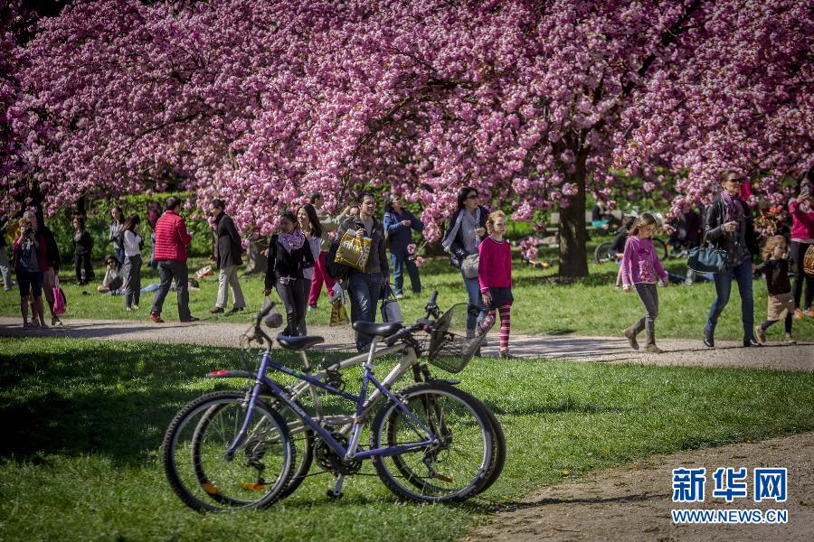 4月19日,在法国巴黎,人们走过公园里停放的自行车。今年4月22日是第46个世界地球日。从年初以来,为保护环境,巴黎市政府已经或将要实施的措施包括在空气污染严重时实行私用汽车单双号行驶、设立可免费租用公共自行车、继续修建污染少的地面轻轨交通线路、大幅度增加电动公交车和电动出租车的比例等。新华社记者陈晓伟摄