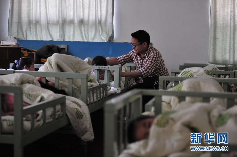吴鸣宸为孩子们盖被子。(新华网发 吴隆摄)