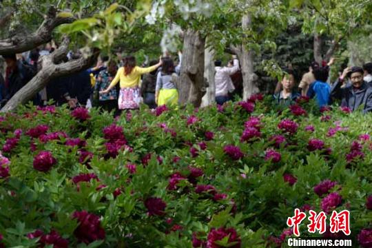 4月21日上午,游客在新疆库尔勒市“梨香园”里赏牡丹。确·胡热 摄