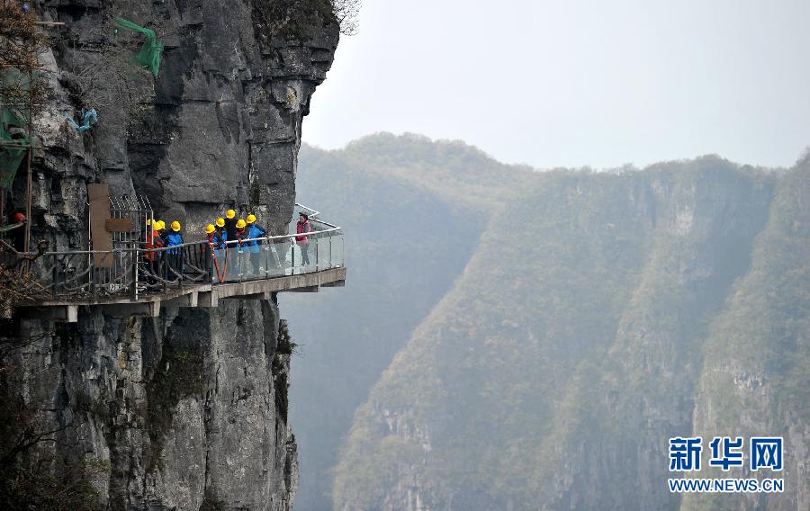 4月21日,西线栈道玻璃更换完工,预计五一小长假对外开放。天门山西线玻璃栈道于2011年10月1日正式开放,惊险刺激的视觉感受吸引了海内外游客前来观光体验。截至2015年3月,该栈道已接待中外游客430余万人。新华社发(邵颖 摄)
