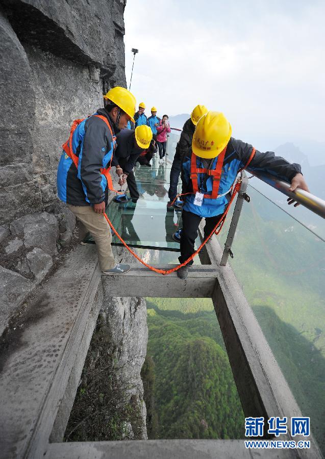 4月21日,施工人员在进行栈道玻璃的更换施工。新华社发(邵颖 摄)