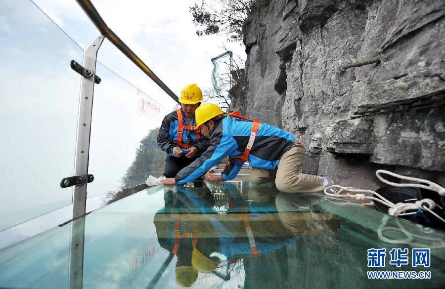 4月21日,施工人员在进行栈道玻璃的更换施工。新华社发(邵颖 摄)