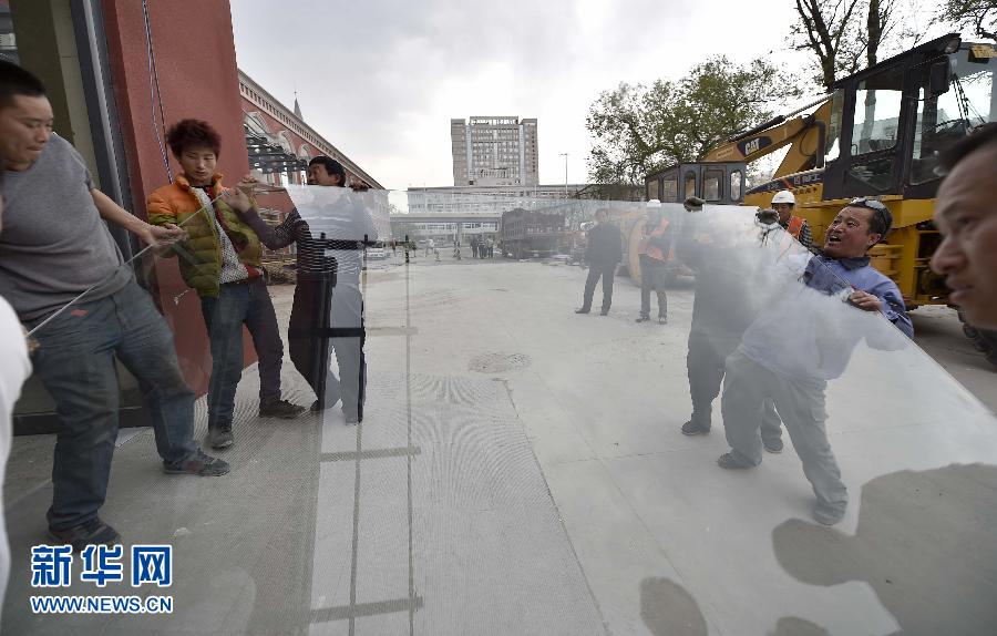4月21日,工作人员在搬运新候车厅的玻璃。近日,始建于1903年的天津北站在关闭一年后重新整修,对候车大厅、站台和钟楼进行修缮,为4月30日即将开通的津蓟铁路市郊客车做准备,恢复客运业务。天津北站于2014年4月1日停办客运业务。新华社记者岳月伟摄