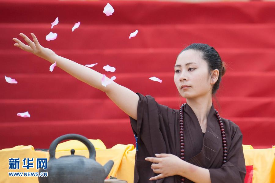 4月21日,在浙江省景宁畲族自治县惠明寺村,茶女在进行禅茶表演。