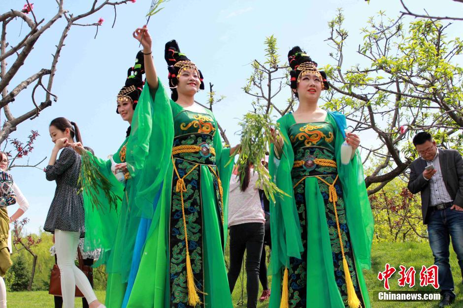 4月21日,是中国传统农历的三月三“上巳节”,也称女儿节、春浴日。唐代时,上巳节已成为全年三大节日之一。古人讲究在“上巳节”这天春游踏青,临水宴饮,佩兰祓禊,祈福。这一习俗在中国及其周边国家与地区至今仍有延续。柳影摇曳临风起舞,青青成荫萦绕湖畔,身着古装的仕女手持桃花,在水边"祓禊",向游客洒水施礼,洗濯去垢,消除不详。众多游客现场感受了这一源于上古的传统文化,使濒临消失的国学文化得到进一步传播与发扬。李思默 摄
