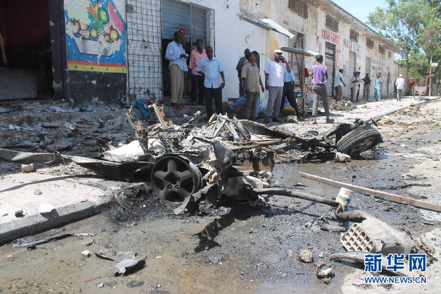 4月21日,在索马里首都摩加迪沙,人们聚集在袭击现场。当日,索马里首都摩加迪沙一家饭店遭到自杀式袭击,造成至少10人死亡。目击者说,一辆汽车在试图冲入饭店时发生爆炸。新华社发(阿卜迪拉赫曼·侯赛因摄)