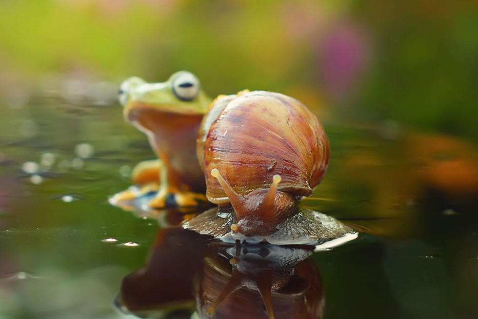 雨蛙趴蜗牛身上“搭便车”过河。(网页截图)