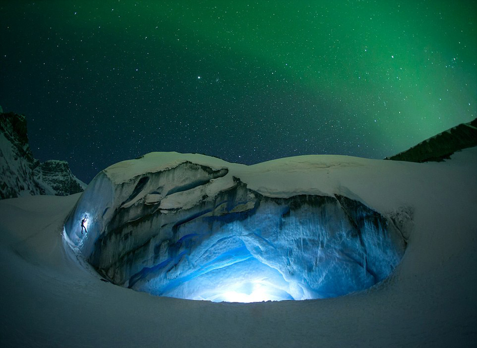 三人特意选择了晴朗的一天来完成这次拍摄。照片中,不断闪耀的北极光和沉寂在大地上巍然不动的冰川动静结合,形成了美妙的对比,再加上夜晚璀璨的星空,宛如置身超现实魔幻场景之中。