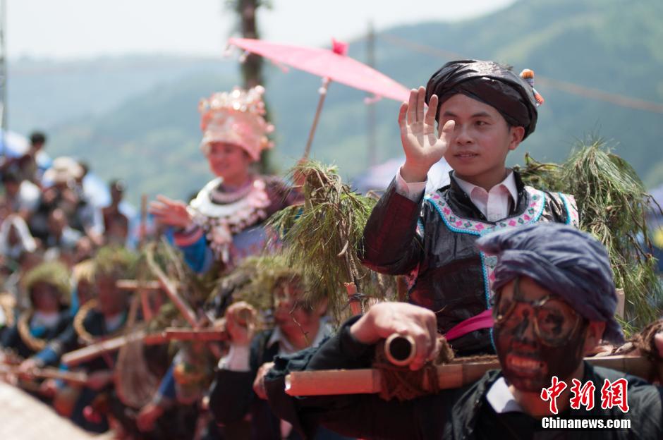 4月21日,在广西三江侗族自治县举行“三月三”花炮节,其中侗族民俗活动“抬官人”受到游客热捧。黄威铭 摄