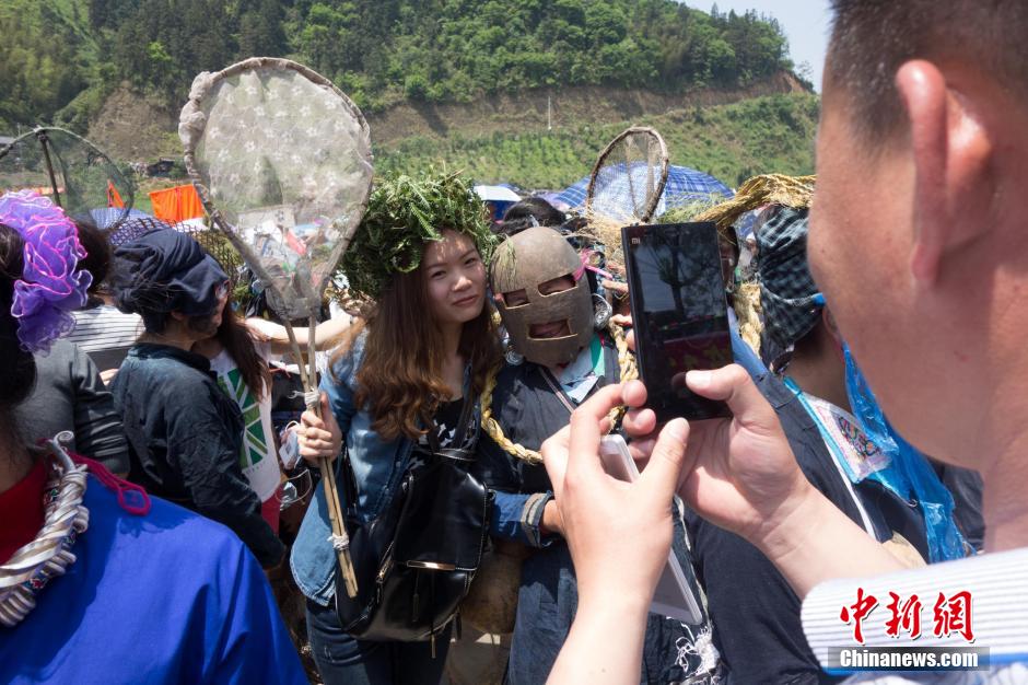 4月21日,在广西三江侗族自治县举行“三月三”花炮节,其中侗族民俗活动“抬官人”受到游客热捧。图为游客和官人演员合照。黄威铭 摄