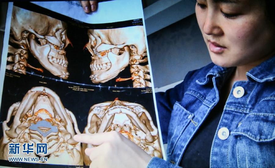 赴韩整形失败者靳魏坤向记者展示她手术后的CT片(4月1日摄,视频翻拍)。 新华社记者 孟菁 摄 图片来源:新华网