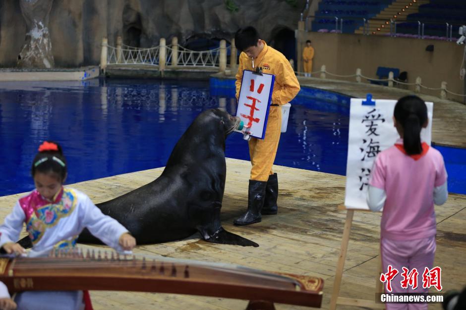 4月23日,北京海洋馆举办的第五届“爱海洋·爱环保”儿童书画大赛暨海洋小精灵招募启动。本届大赛面向全国范围内征集环保主题的书法、绘画作品,3至18岁青少年儿童均可免费报名参赛,作品征集截止日期为2015年5月31日,优秀作品将在北京海洋馆内进行展出。图为北京海洋馆海狮正在书写中国汉字“羊”。中新社发 杨阳 摄
