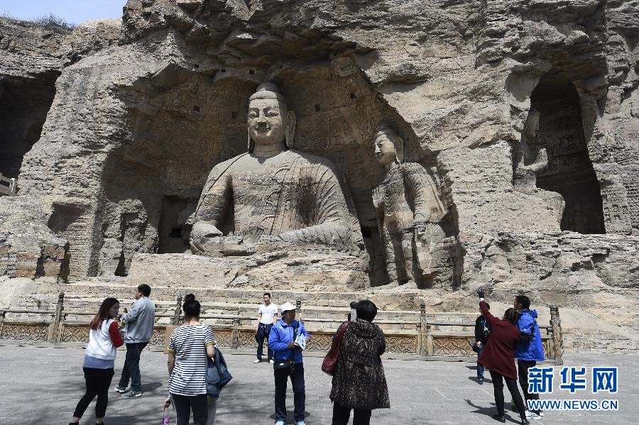 4月22日,游客在云冈石窟景区参观。 “五一”小长假将至,山西大同云冈石窟景区即将迎来客流高峰。云冈石窟始建于北魏年间,是我国著名的佛教艺术宝库,现存主要洞窟45个,大小造像5万余尊,于2001年被联合国教科文组织列入世界文化遗产名录。新华社记者燕雁摄