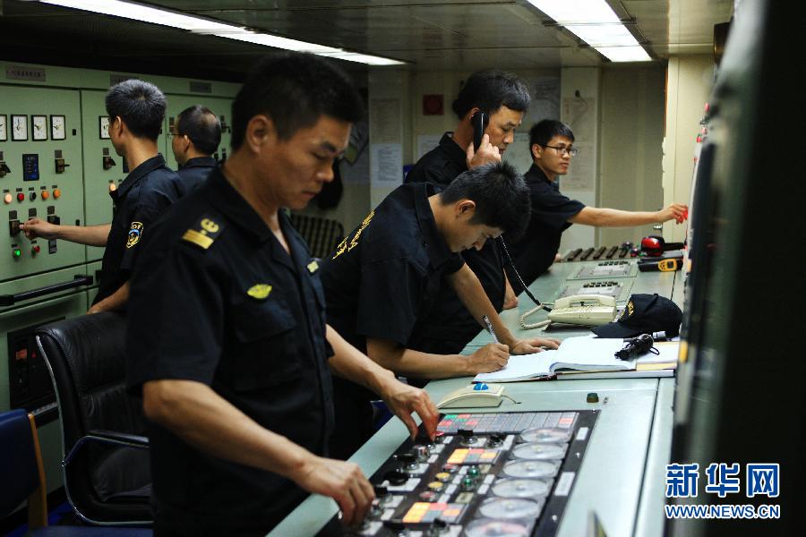 4月22日12点35分,“海巡21”船员在轮机舱控制室内工作。 “海巡21”是中国第一艘千吨级以上可搭载直升机的海事巡逻船。船长93米,标准排水量1500吨,2001年建造完工并于东海服役,2012年加入海南海事局服役至今。两年多时间里,“海巡21”参加了中国南海和琼州海峡各处水域的近百次任务。 4月21日,海南海事局“海巡21”与“海巡1103”船舶编队从三亚启航,开赴西沙海域开展为期3天的巡航执法行动。 新华社记者 郭求达摄