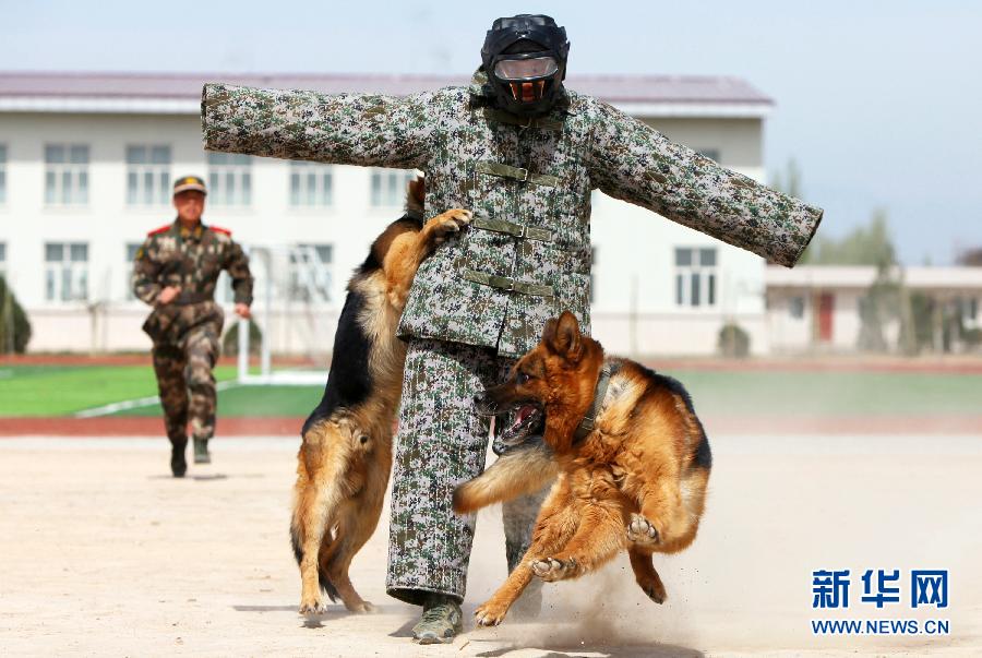 4月22日,在武警宁夏总队直属支队训练场上,张帅帅在训练警犬。 “95后”的张帅帅是武警宁夏总队直属支队警犬班的一名上等兵助训员。到警犬班半年多来,他几乎每天都要身穿15公斤重的扑咬服与十几只警犬一起训练。新华社发(周焕成 摄)