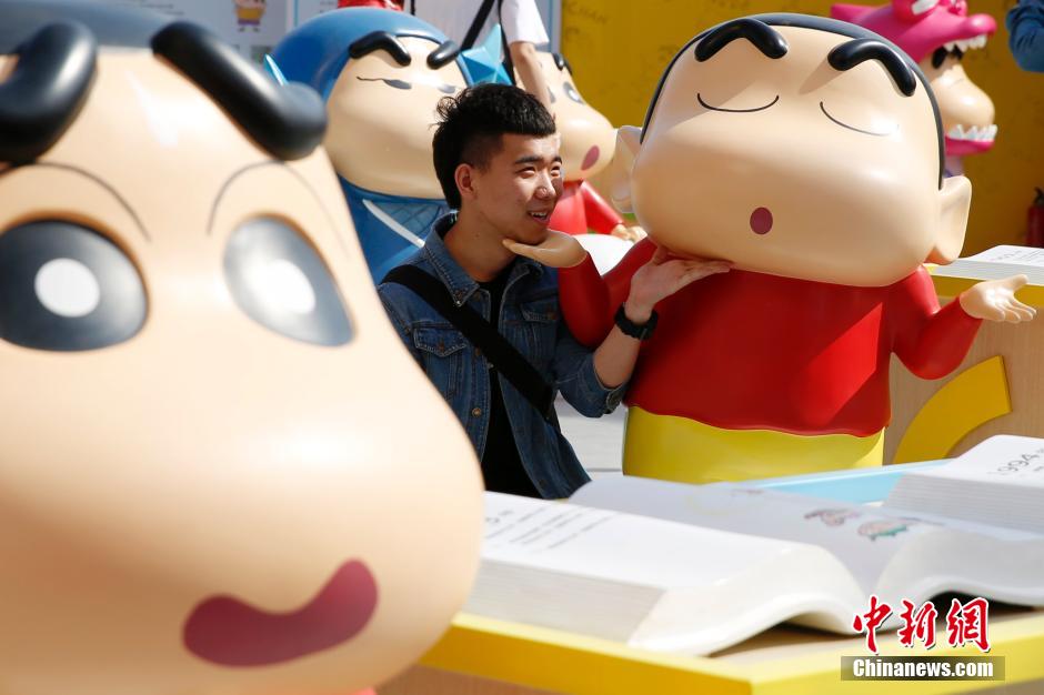 4月22日,游客与蜡笔小新合影。“蜡笔小新25周年纪念特展”日前在北京开展,吸引了不少市民游客。据悉,此次展览集合了近50组身高105公分的1:1比例的蜡笔小新,是国内最大规模的小新主题展览,展览将持续6月22日。中新社发 李慧思 摄