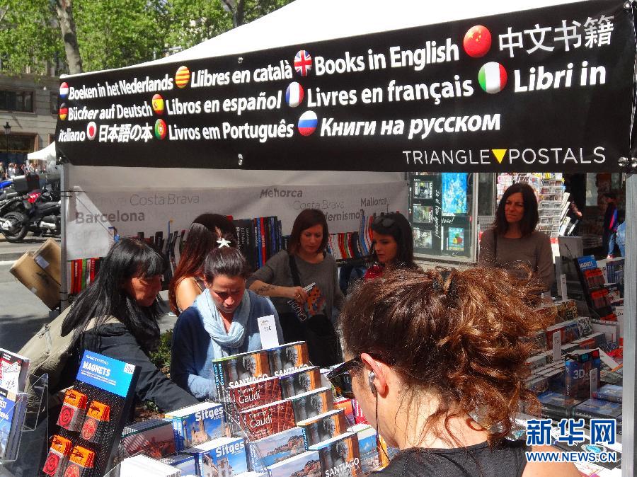4月23日,在西班牙巴塞罗那市中心的加泰罗尼亚广场,几名女子正在逛书摊。 当天是“世界读书日”,也是西班牙加泰罗尼亚地区的传统节日“圣乔治节”。在巴塞罗那市中心的加泰罗尼亚广场周围以及兰布拉大街上,临时搭建起很多卖书或者卖花的摊位。大街上随处可以见到手持鲜花的女士,还有拎着一口袋书的男士。根据风俗,节日当天男士会向女士赠送一朵玫瑰,以示骑士风度;作为回馈,女士会赠送男士一本书籍,象征知识与力量。 新华社记者周喆摄